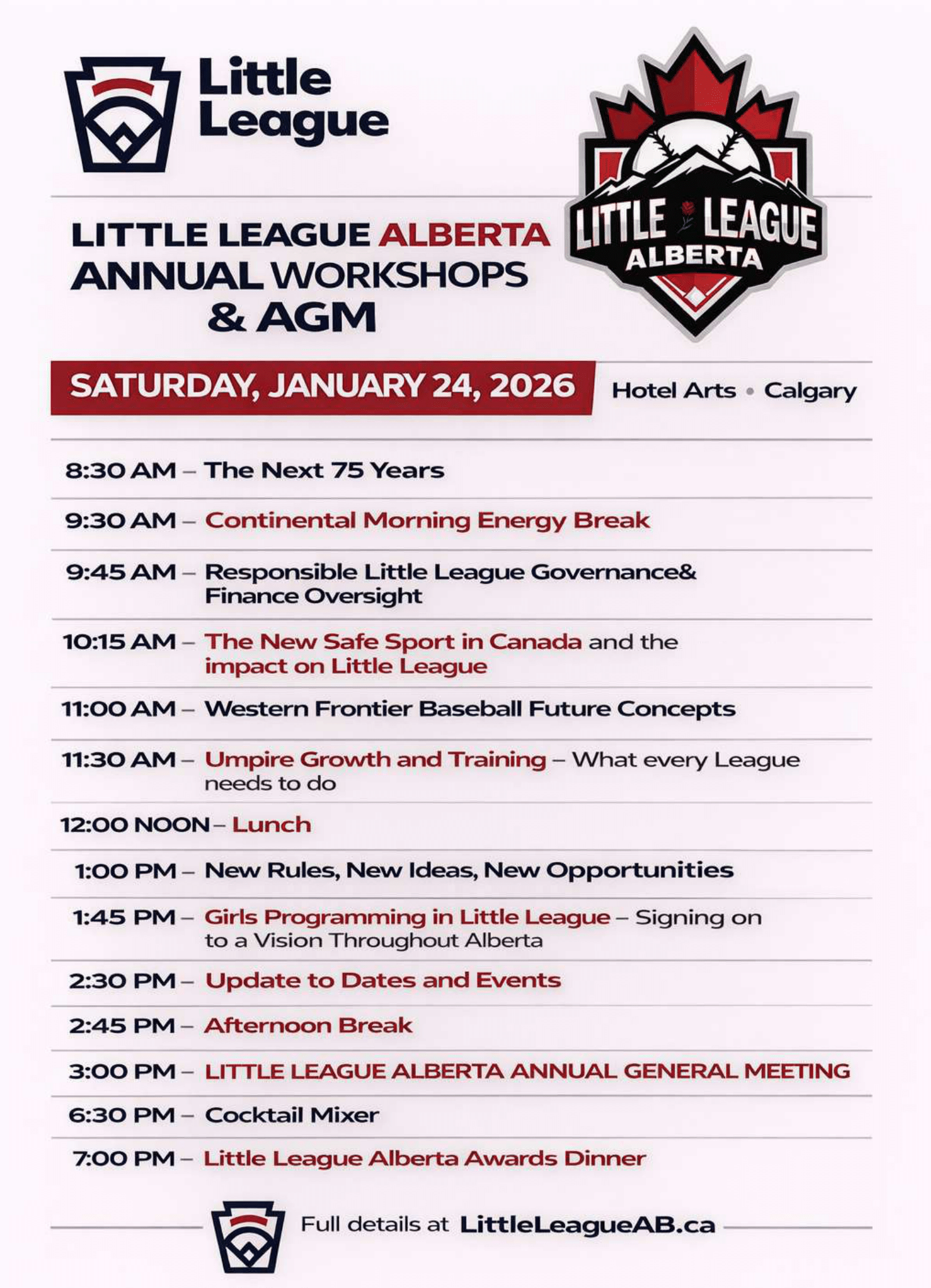 Little League Alberta is hosting the Little League Alberta Annual General Meeting (AGM) Weekend, on Friday, January 23 and Saturday, January 24, 2026, at Hotel Arts in Calgary, Alberta.