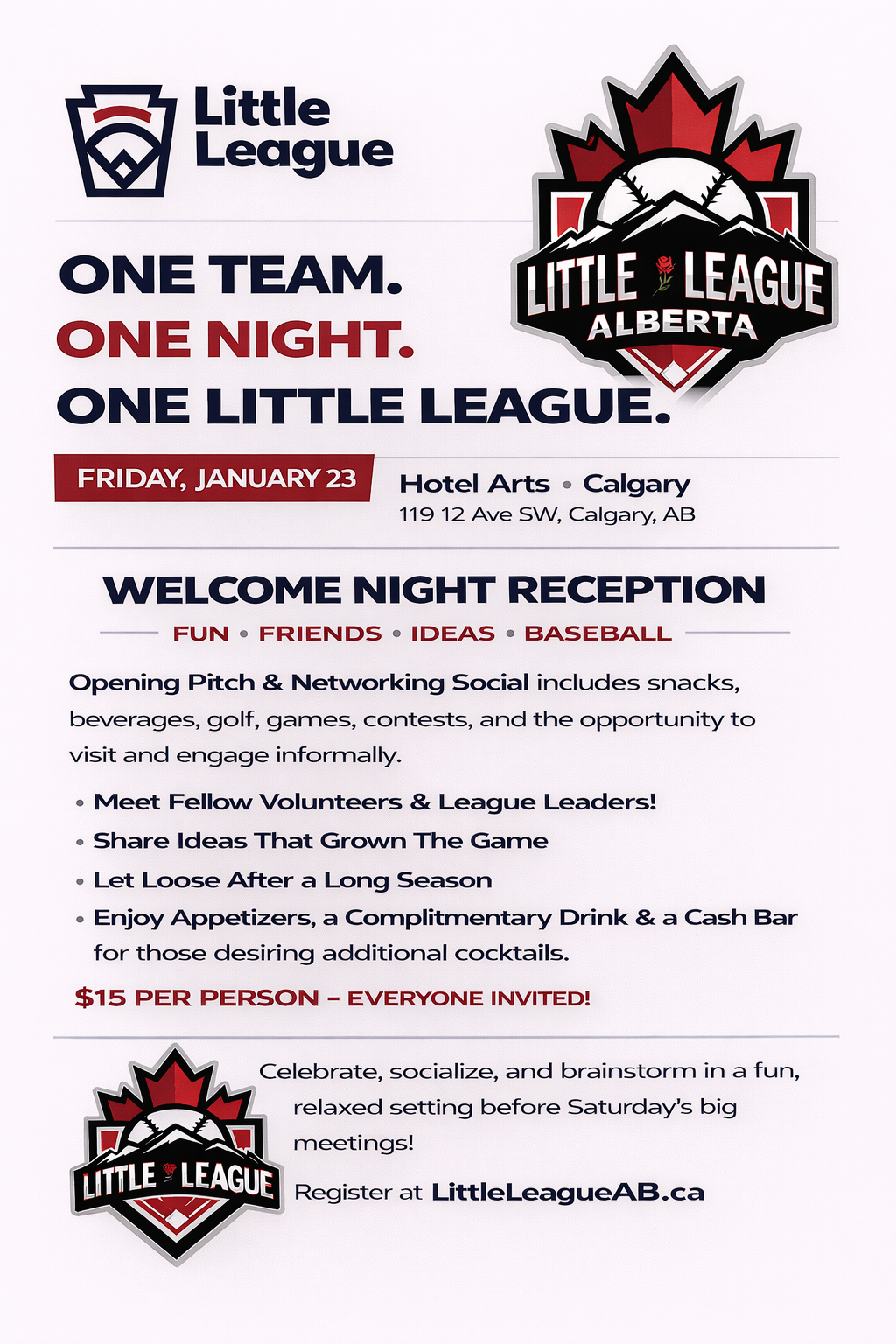 Little League Alberta is hosting the Little League Alberta Annual General Meeting (AGM) Weekend, on Friday, January 23 and Saturday, January 24, 2026, at Hotel Arts in Calgary, Alberta.