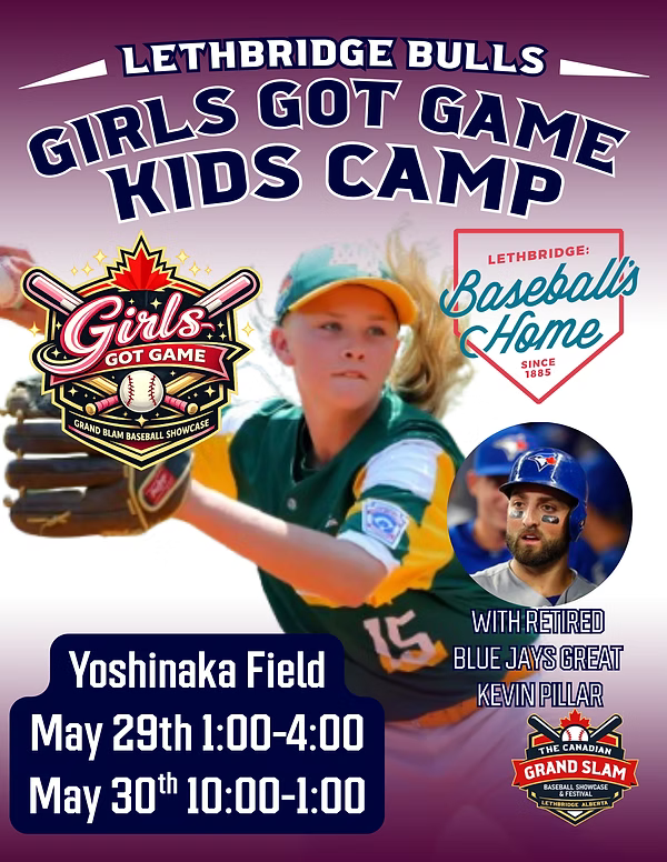 The Girls Got Game Kids Camp is coming to Lethbridge this May, offering young athletes an exciting opportunity to learn, play, and grow their love of baseball in a fun and supportive environment. Hosted at Yoshinaka Field on May 29 (1:00-4:00 PM) and May 30 (10:00 AM-1:00 PM), this camp is part of the Canadian Grand Slam Baseball Showcase and is designed to inspire the next generation of players. Participants will develop their skills through hands-on instruction, drills, and game play, all while learning from experienced players and coaches from the Lethbridge Bulls and special guest retired Toronto Blue Jays standout Kevin Pillar. Whether your child is new to the game or looking to sharpen their abilities, Girls Got Game delivers an unforgettable baseball experience focused on confidence, teamwork, and having fun on the field.